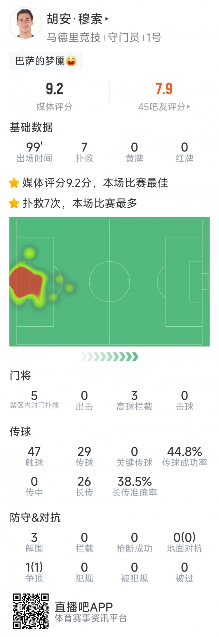 本场比赛马竞门将穆索发挥出色,贡献7次成功扑救,47次触球,传球成功率45%天津炒股配资开户,3次解围,评分9.2分全场最高。